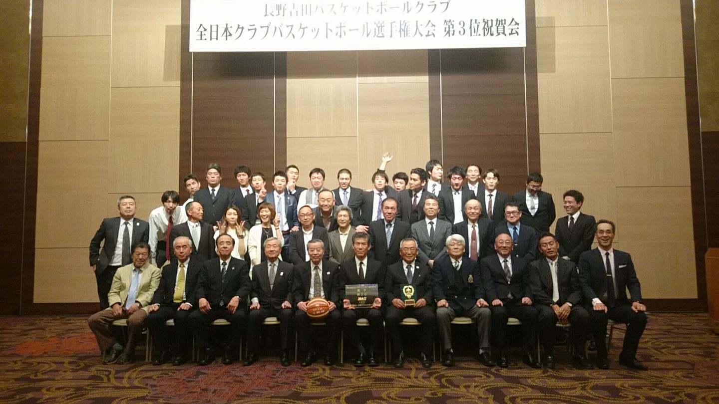 全日本クラブバスケットボール選手権大会第3位祝賀会! 吉田クラブ(NY) 2024.04.29 長野吉田クラブの全クラ3位を祝して祝賀会を開催祝賀会の模様の一部を掲載しました。 長野吉田バスケットボールクラブ行事2017年4月 全日本クラブバスケットボール選手権大会 第3位 祝賀会周年事業の様子